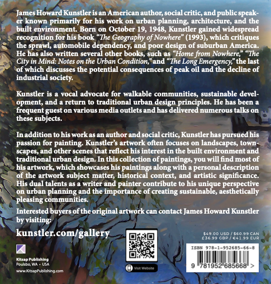 In addition to his work as an author and social critic, Kunstler has pursued his passion for painting. Kunstler’s artwork often focuses on landscapes, townscapes, and other scenes that reflect his interest in the built environment and traditional urban design. In this collection of paintings, you will find most of his artwork, which showcases his paintings along with a personal description of the artwork subject matter, historical context, and artistic significance. His dual talents as a writer and painter contribute to his unique perspective on urban planning and the importance of creating sustainable, aesthetically pleasing communities.