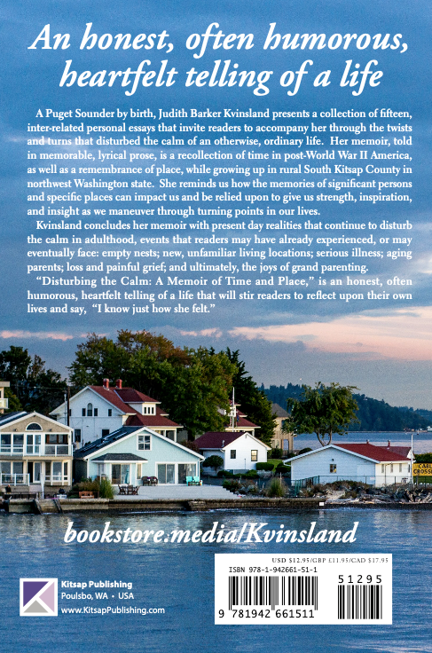 A Puget Sounder by birth, Judith Barker Kvinsland presents a collection of fifteen, inter-related personal essays that invite readers to accompany her through the twists and turns that disturbed the calm of an otherwise, ordinary life. Her memoir, told in memorable, lyrical prose, is a recollection of the time in post-World War II America, as well as a remembrance of place, while growing up in rural South Kitsap County in northwest Washington state. She reminds us how the memories of significant persons and specific places can impact us and be relied upon to give us strength, inspiration, and insight as we maneuver through turning points in our lives.