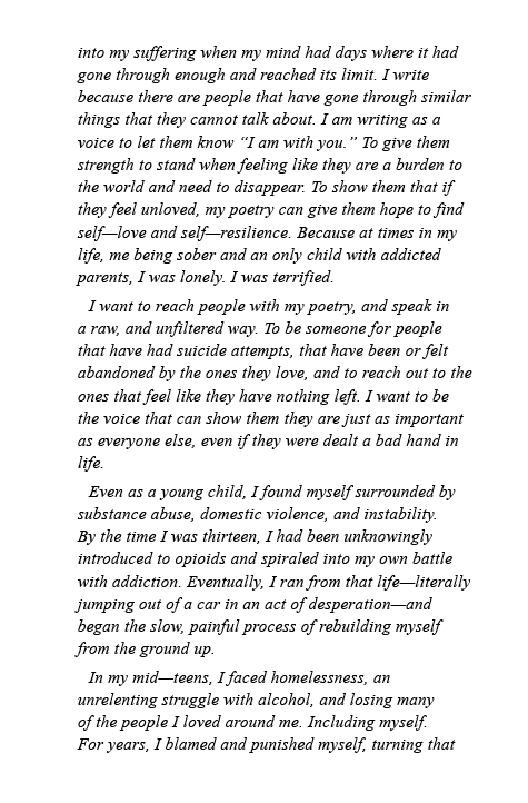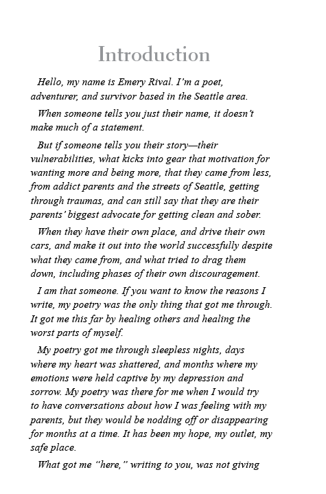 Born and raised in the Seattle area, Emery Rival endured violence and addiction from an early age, eventually finding herself in the grip of the very struggles that ravaged her home. Determined to break a generational cycle, she pursued sobriety, receives intensive therapy, and emerged as a survivor and as an advocate for others. Through her poetry, Emery shares her truth in hopes of reminding every reader that, even in our most broken moments, we can still choose to rise.