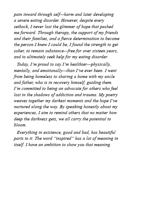 From a childhood shaped by her parents’ addictions to her own battle with substance abuse and homelessness, Emery Rival knows the depths of despair all too well. Yet in the face of violence, trauma, and profound loss, she discovered an unbreakable will to survive. In Finding Comfort Within the Chaos, Emery weaves together the raw moments of her life—relentless struggles with addiction, self-harm, and an eating disorder—into poetry that both stings with truth and resonates with hope.