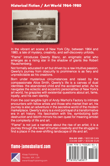 In the vibrant art scene of New York City between 1964 and 1980, a tale of mystery, creativity, and self-discovery unfolds. "Flame" introduces Qwerty Blanc, an enigmatic artist who emerges as a rising star in the shadow of giants like Robert Rauschenberg. Not formally educated in art but driven by a raw, intuitive passion, Qwerty's journey from obscurity to prominence is as fiery and unpredictable as his creations.
