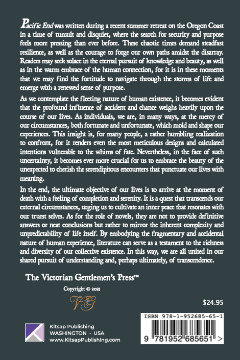 Pacific End was written during a recent summer retreat on the Oregon Coast in a time of tumult and disquiet, where the search for security and purpose feels more pressing than ever before. These chaotic times demand steadfast resilience, as well as the courage to forge our own paths amidst the disarray. Readers may seek solace in the eternal pursuit of knowledge and beauty, as well as in the warm embrace of the human connection, for it is in these moments that we may find the fortitude to navigate through the storms of life and emerge with a renewed sense of purpose.