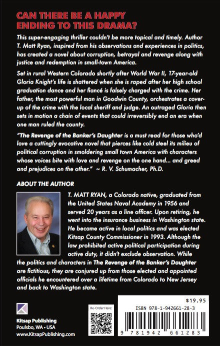 Between the two places, he saw enough questionable officeholders to fill a courthouse. After a career as a line officer, he retired from the Navy and settled in Washington state where he became involved in local politics. He was elected County Commissioner and served 1993-1996. It wasn’t until 2011 after he sold his insurance practice that he devoted full attention to the writing arts. Matt Ryan, a Colorado native, is married to his wife of fifty-one years, Patricia. They have four sons, and 3 grandchildren. He is the author of “The Revenge of the Banker’s Daughter” and “The Emperor Butterfly.